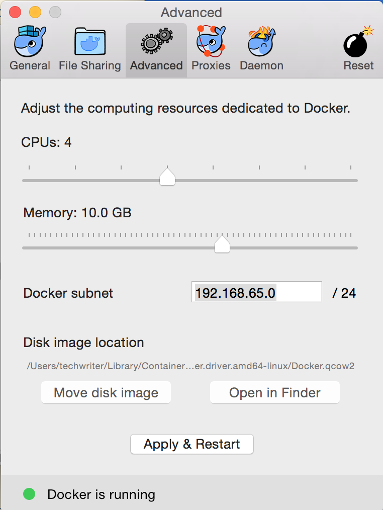 - Adjust the amount of memory given to Docker to be at least 10 GB. Driverless AI won’t run at all with less than 10 GB of memory. You can optionally adjust the number of CPUs given to Docker. You will find the controls by clicking on (Docker Whale)->Preferences->Advanced as shown in the following screenshots. (Don’t forget to Apply the changes after setting the desired memory value.)