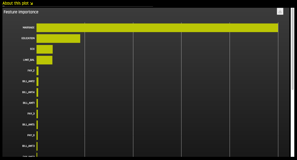 - Dashboard: A single page with a Global Interpretable Model Explanations plot, a Feature Importance plot, a Decision Tree plot, and a Partial Dependence plot. See the Dashboard Page section for more information.