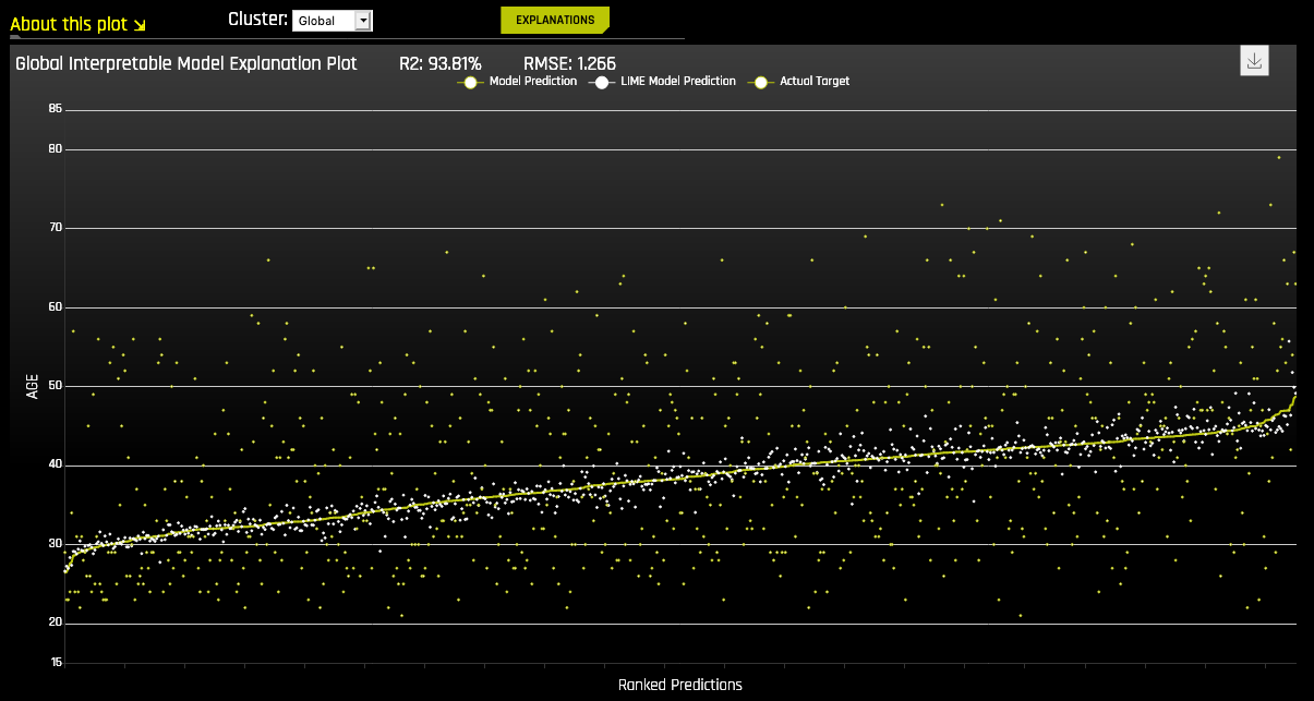 This plot shows Driverless AI model predictions and LIME model predictions in sorted order by the Driverless AI model predictions. This graph is interactive. Hover over the Model Prediction, LIME Model Prediction, or Actual Target radio buttons to magnify the selected predictions. Or click those radio buttons to disable the view in the graph. You can also hover over any point in the graph to view LIME reason codes for that value. By default, this plot shows information for the global LIME model, but you can change the plot view to show local results from a specific cluster. The LIME plot also provides a visual indication of the linearity of the Driverless AI model and the trustworthiness of the LIME explanations. The closer the local linear model approximates the Driverless AI model predictions, the more linear the Driverless AI model and the more accurate the explanation generated by the LIME local linear models.