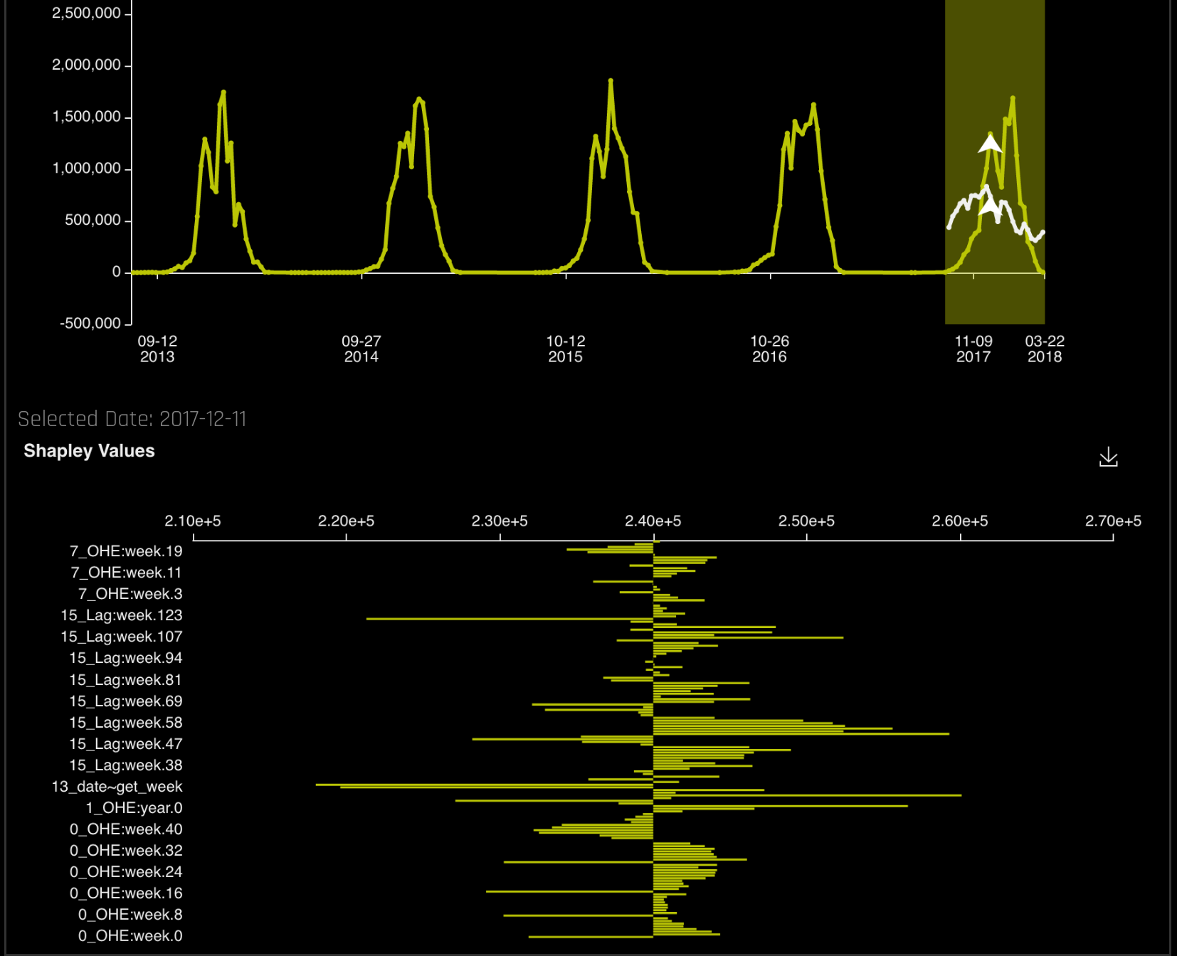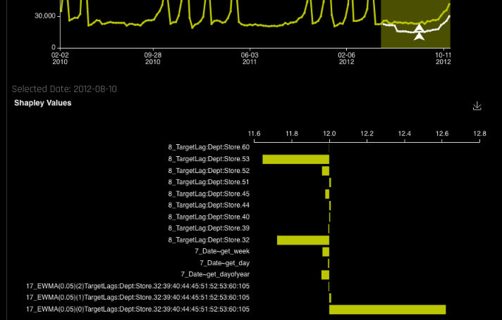 - Click on a prediction point in the plot (white line) to view Shapley values for that prediction point. The Shapley values plot can also be downloaded to your local machine.