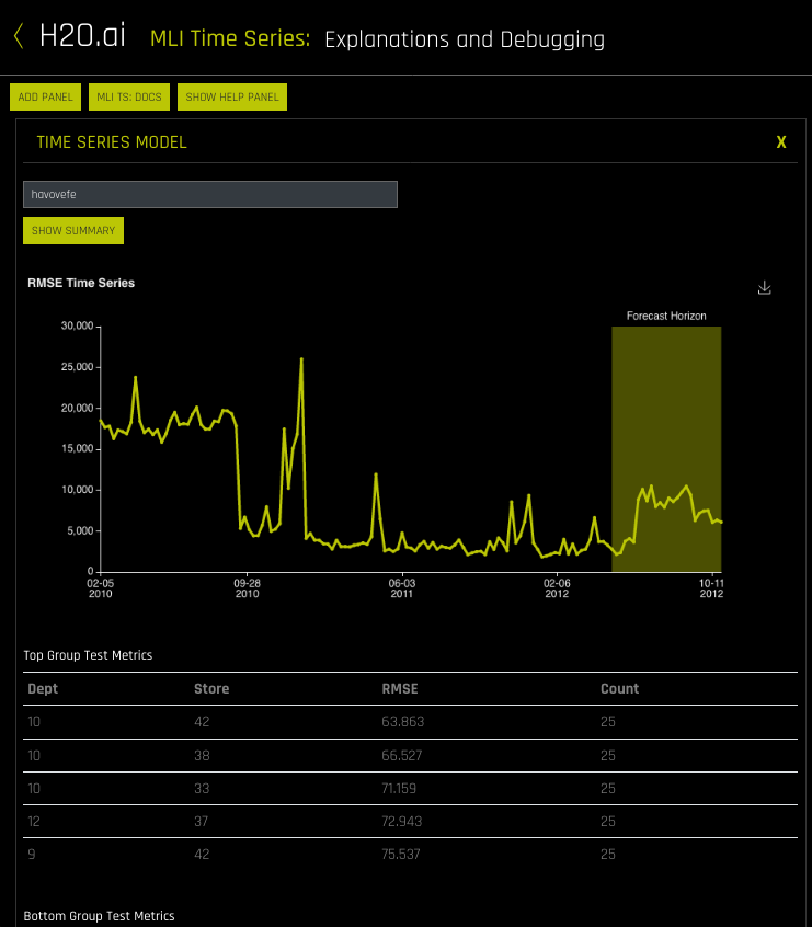 - If the test set includes actuals, then a panel will display showing a time series plot and the top and bottom group matrix tables based on the scorer that was used in the experiment. Note that this panel can be resized if necessary.
