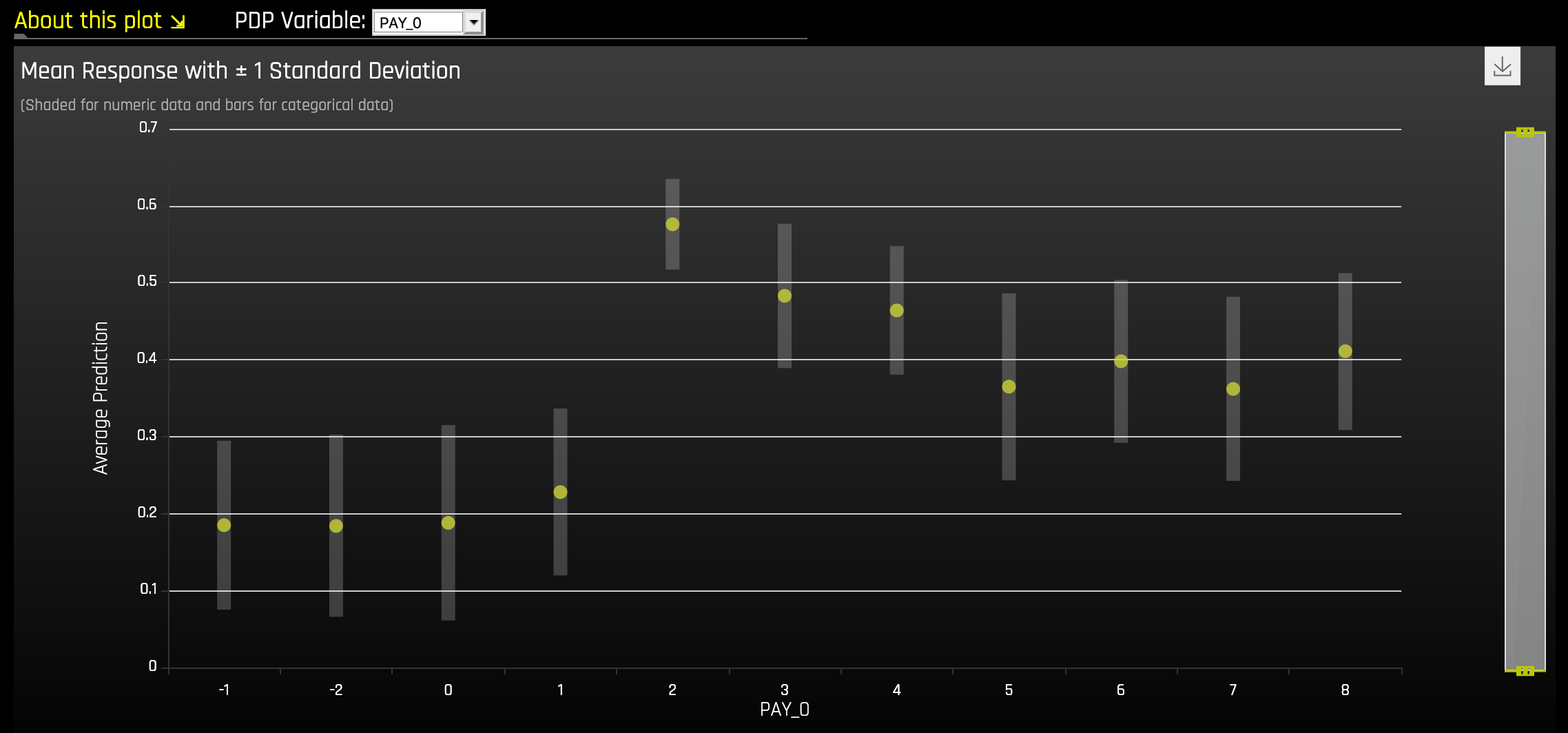 This plot shows the partial dependence when a variable is selected and the ICE values when a specific row is selected. Users may select a point on the graph to see the specific value at that point. Partial dependence (yellow) portrays the average prediction behavior of the Driverless AI model across the domain of an input variable along with +/- 1 standard deviation bands. ICE (grey) displays the prediction behavior for an individual row of data when an input variable is toggled across its domain. Currently, partial dependence and ICE plots are only available for the top ten most important original input variables. Categorical variables with 20 or more unique values are never included in these plots.